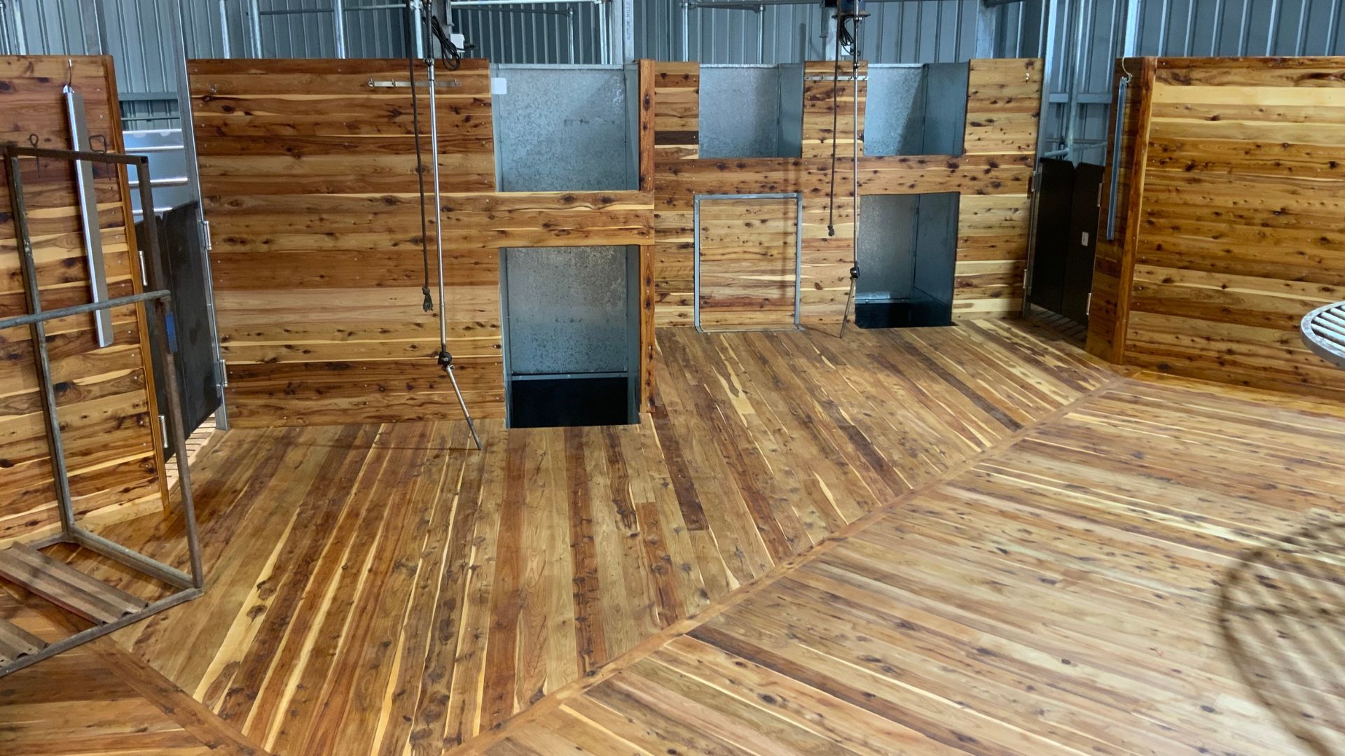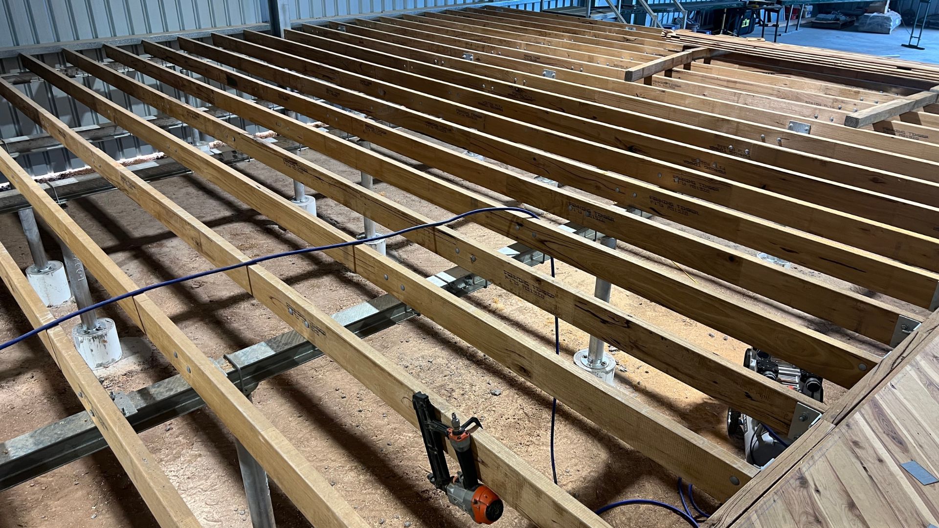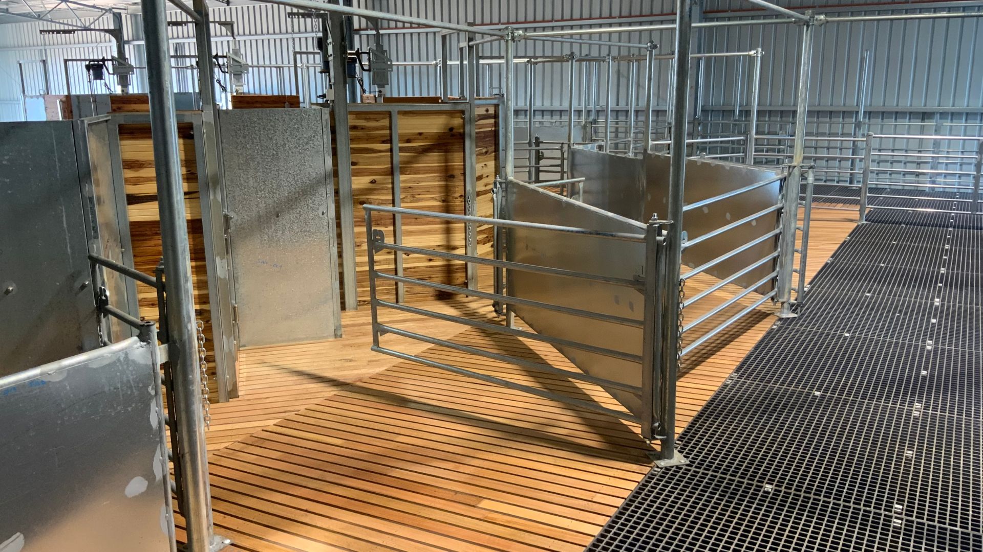 Contractors were focussed when they took on this L Shaped 5 stand Sawtooth Board at Birchip Vic recently. With a raised wool room, the extent of the Cypress Pine tongue and groove timber was extensive. With meticulous attention to detail by the team, the shed came together with unparalleled accuracy. The interfaces between FRP and grating were particularly important and a seamless transition has been achieved. Forward planning and scheduling by the team led to fast installation to the highest quality and the client is delighted. The new shed is fed from an existing shed which always proves tricky when it comes to ramp angles and interfaces. The existing shed grating has had some upgrading as well incorporating FRP to replace the tired timber grating.